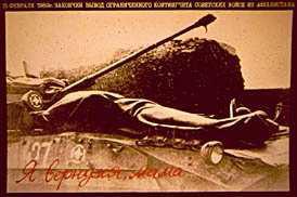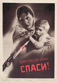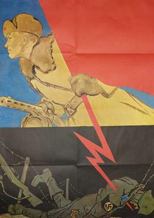 Caricature d'un soldat soviétique, tenant en main un drapeau rouge (symbole soviétique), poignardant un soldat nazi, au sol, dans l'obscurité. Le soldat soviétique se dirige, dans la lumière, vers l'avenir.