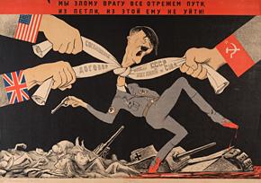 Caricature représentant le leader nazi, Adolf Hitler, étranglé par les puissances américaines, britanniques et soviétique, relatant le traité d'union de ces 3 pays, lors de la seconde guerre mondiale, après l'invasion Barbarossa (1941).