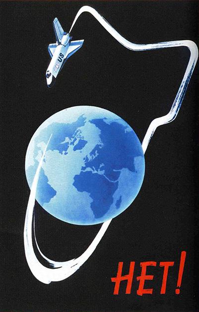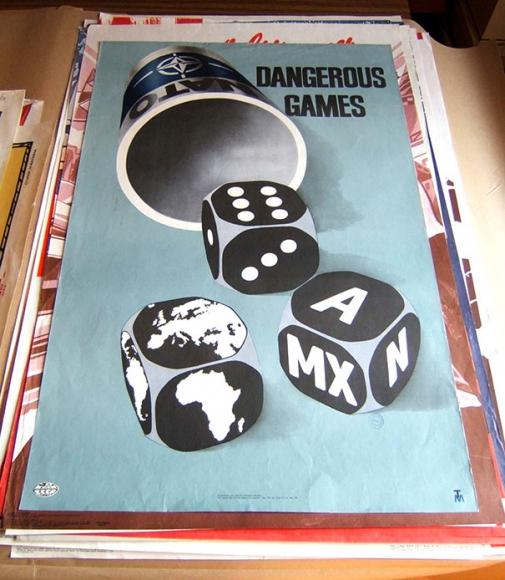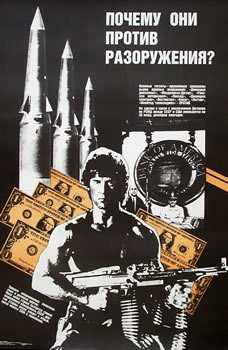 Affiche qui reprend les codes iconographiques et culturels américains (armes, dollars, le Rambo joué par Stallone) sur un ton humoristique pour présenter les États-Unis comme bellicistes.