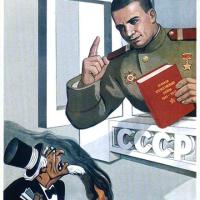 - Caricature d'un soldat soviétique mettant en garde une allégorie des USA, tenant une ogive en main.