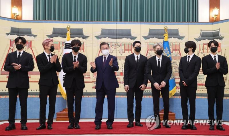 Le président Moon Jae-in (4e à partir de la gauche) et les membres de BTS posent pour une photo commémorative à Cheong Wa Dae à Séoul, le 14 septembre 2021. BTS a été nommé envoyé spécial pour la diplomatie publique avant une session annuelle de l'ONU.