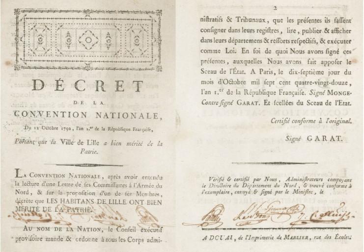 Le 12 octobre 1792 de l’an I de la République française, la Convention nationale publie un décret portant que la ville de Lille a bien mérité de la Patrie. La Convention fait cela d’abord pour féliciter la bravoure et le courage des Lillois face à l’armée impériale mais aussi pour inciter les autres personnes à soutenir la jeune République.