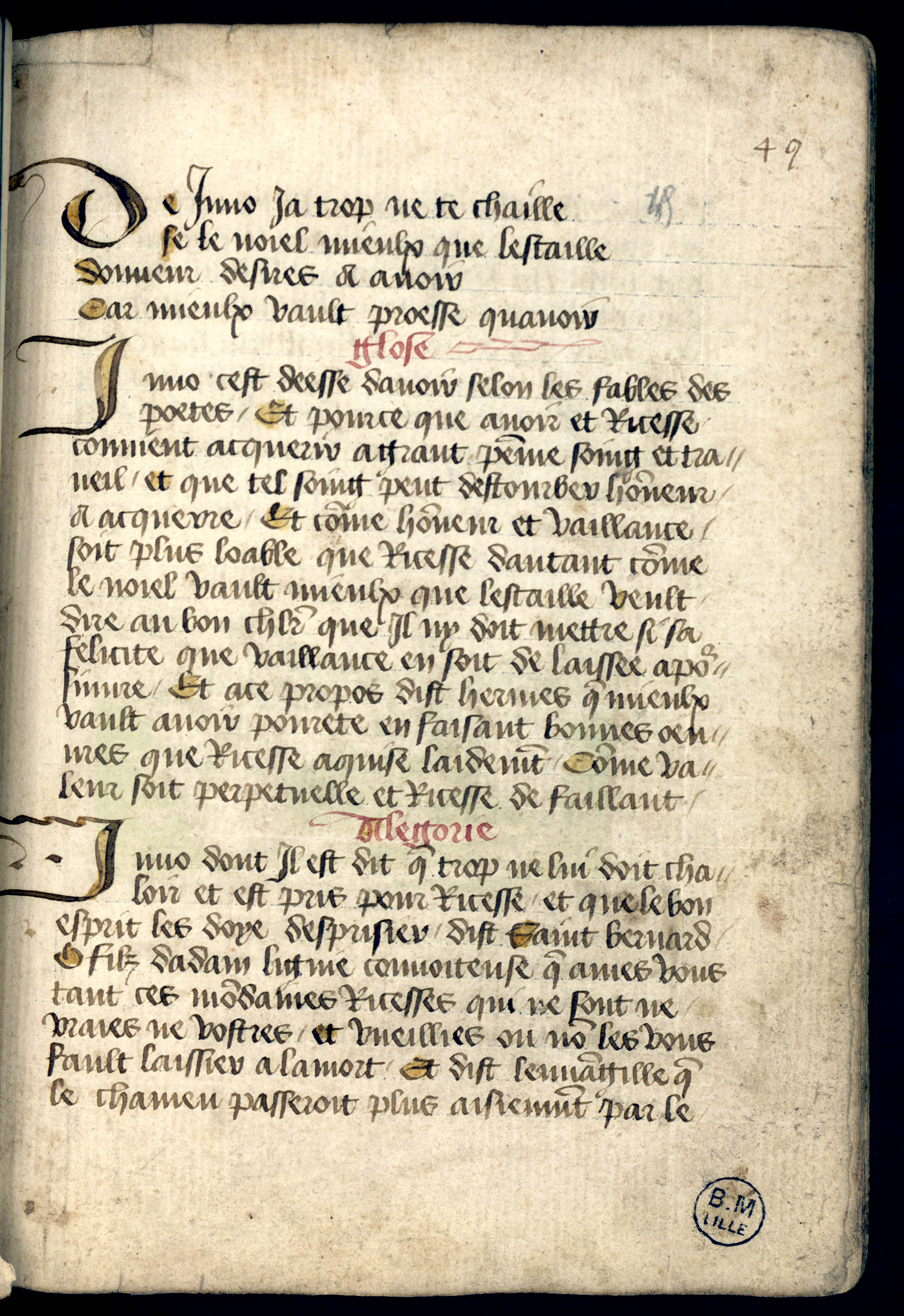 Extrait sur Junon, déesse de la richesse, est présenté comme une allégorie de la possession matérielle et une mise en garde contre l’avidité. À travers ce texte, Christine de Pizan oppose les bonnes valeurs à l’obsession pour les biens, qui détourne le chevalier de ses véritables devoirs. Le passage commence par un conseil direct : “De Juno ja trop ne te chaille” ; “Se le noiel mieulx que lestaille” ; “Donneur desires a avoir” ; “Car mieulx vault proesse quavoir”. Ici, l’accent est explicitement placé sur la hiérarchie des valeurs, où l’honneur (le noyau) est supérieur à la richesse (l’écorce). Le contraste entre richesse éphémère et valeur éternelle est renforcé par une citation dite d’Hermès : “Mieulx vault avoir povret en faisant bonnes œuvres que richesse acquise laidement”. Montre que la poursuite de richesse amène une vie vaine et dénuée de vertus. L’idée est approfondie par une critique de saint Bernard, qui condamne l’amour des biens mondains : “O fils dadam lygne convoiteuse quoy ames vous tant ces modaines richesses qui ne sont ne vrayes ne vostres et, vueillez ou no, les vous fault laissier alamort”. Christine s’appuie sur l’Évangile, qui condamne l’attachement excessif à la richesse, qui serait un obstacle spirituel majeur : “que le chameu passeroitplus aisiement par le pertuis de lesguille que le riche nataindroit au royaume des chieux”.