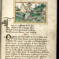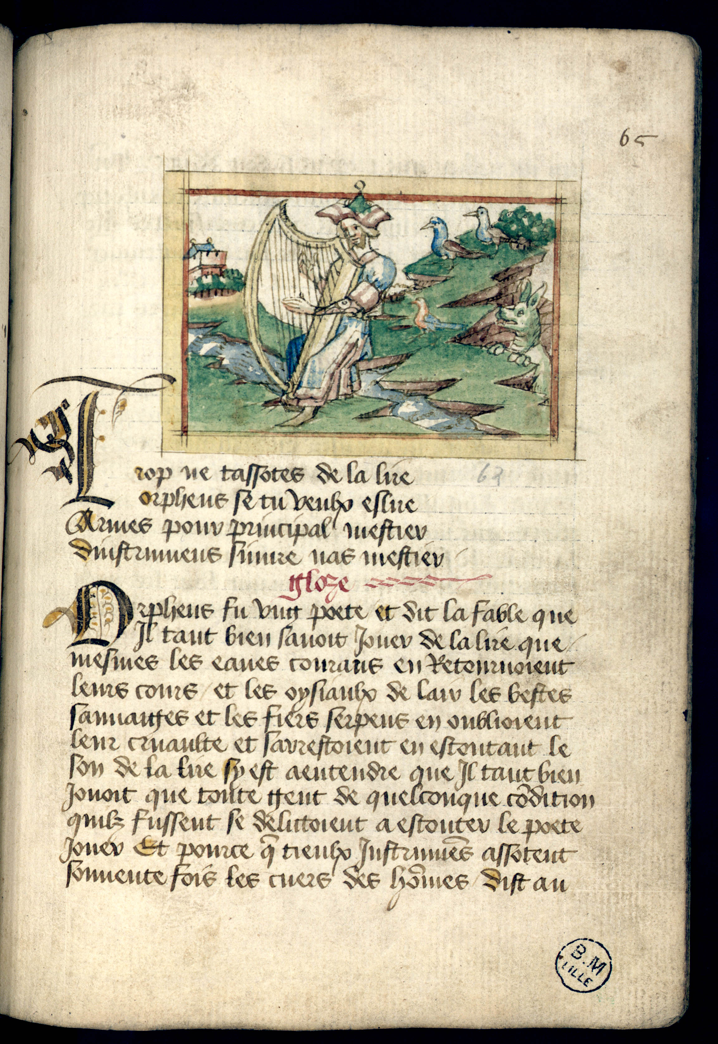 La miniature représente Orphée jouant de la harpe entouré d’animaux. Il est assis près d’un ruisseau, charmant les éléments naturels, les oiseaux, et les bêtes féroces (symbolisées ici par un loup). Sa harpe contient douze cordes, et il porte une tenue apprêtée. L’iconographie fait écho au texte en montrant une scène où le pouvoir d’Orphée est admiré, mais suggère implicitement les dangers de cette fascination excessive.
