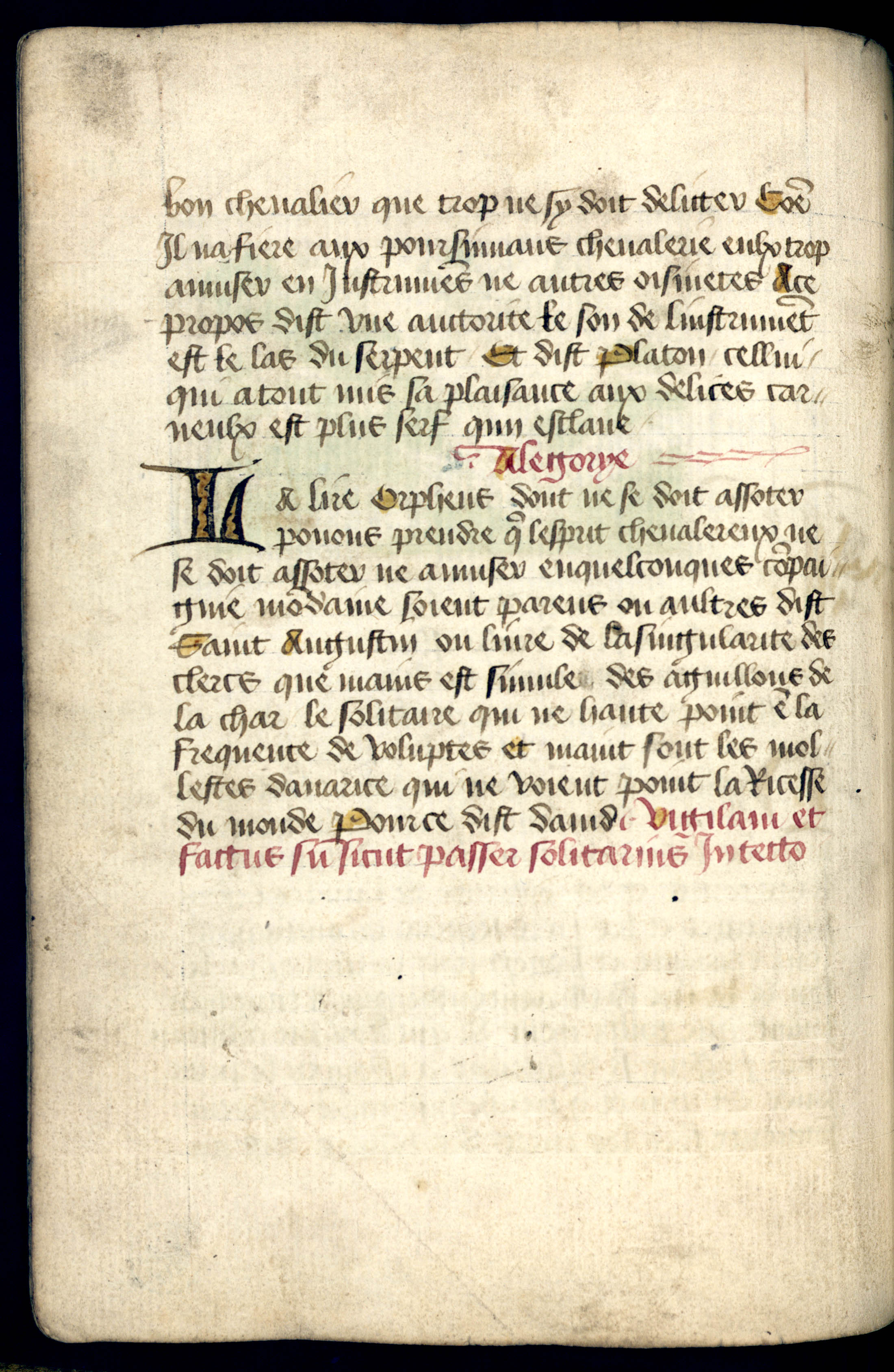 Texte issu du chapitre 67 se concentre sur Orphée, à la fois en tant que figure mythologique et allégorique, évoquant la tension entre le plaisir de l’art et le devoir chevaleresque. Le texte commence par : “Trop ne tassotes de la lire” ; “Orpheus se tu veulx eslire” ; “Armes pour principal mestier” ; “dinstrumens suivre nas mestier”. Ces vers sont une mise en garde contre une excessive fascination pour la musique et les plaisirs qu’elle procure. Elle établit une opposition fondamentale entre deux vocations : la voie des armes (“principal mestier”) correspondant au rôle traditionnel du chevalier ; et les instruments et distractions charnelles (“delices charnelles”) et mondaines (“compaignie mondaine”). La musique ici symbolise les plaisirs, perçus comme un danger pour celui qui doit se consacrer à des devoirs plus nobles. Orphée est cité comme exemple négatif, non pour sa virtuosité, mais pour ce qu’elle représente : un risque de distraction et d’oisiveté.