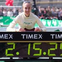 - La Britannique Paula Radcliffe célèbre son record du monde établi le 16 avril 2003