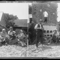 - 3 femmes assises dans des décombres avec un soldat se tenant sur la gauche