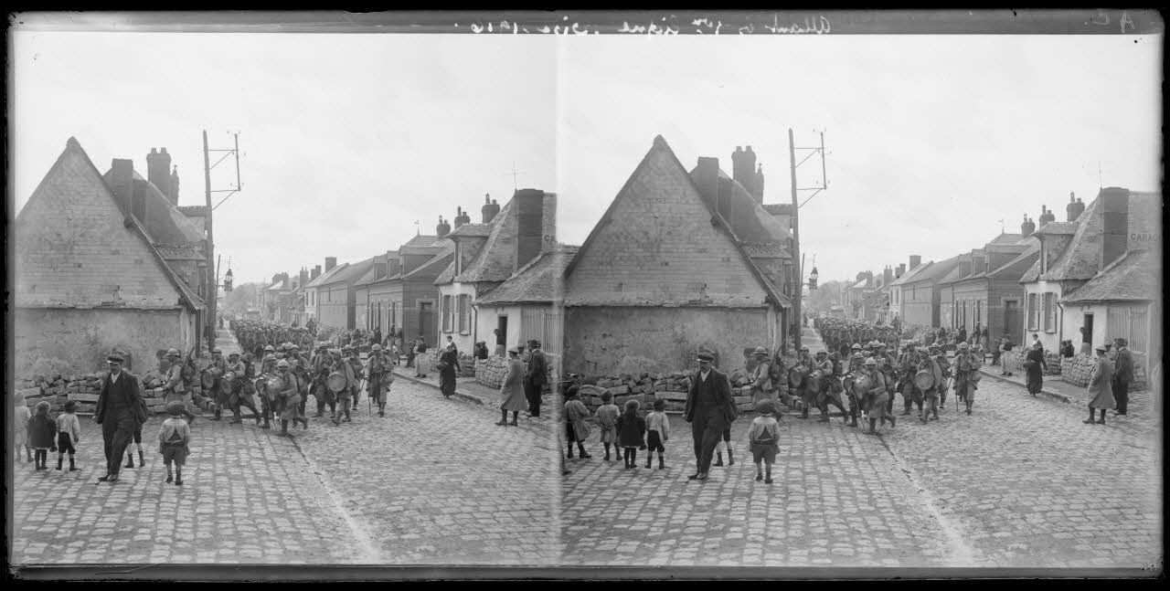 Colonne de soldats partant en première ligne. On peut constater que les soldats à l’avant sont en train de courir. L’image dégage un sentiment d’urgence. Ce sentiment est contrasté par les jeunes enfants au premier plan à gauche, et les adultes de l’autre côté, qui les observe immobiles en train de passer.