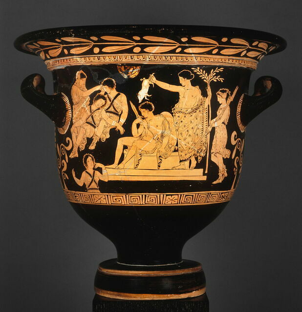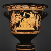 Cratère en cloche apulien à figures rouges, dit "Cratère des Euménides" : Réveil des Erinyes et purification d'Oreste à Delphes