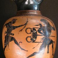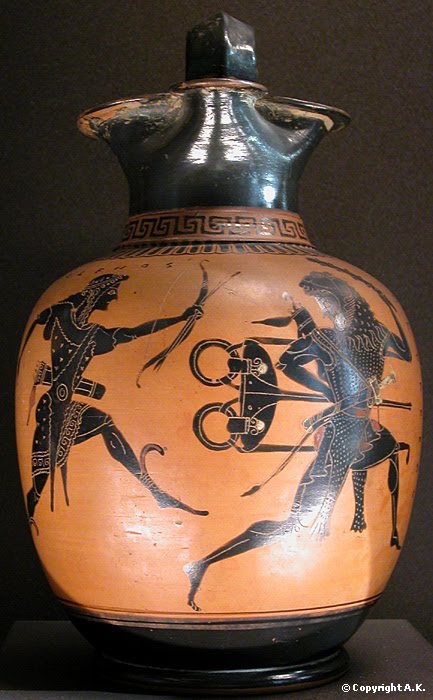 Dispute d'Héraclès et Apollon pour le trépied de Delphes. Œnochoé attique à figures noires, vers 520 av. J.-C.