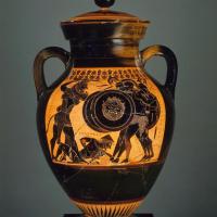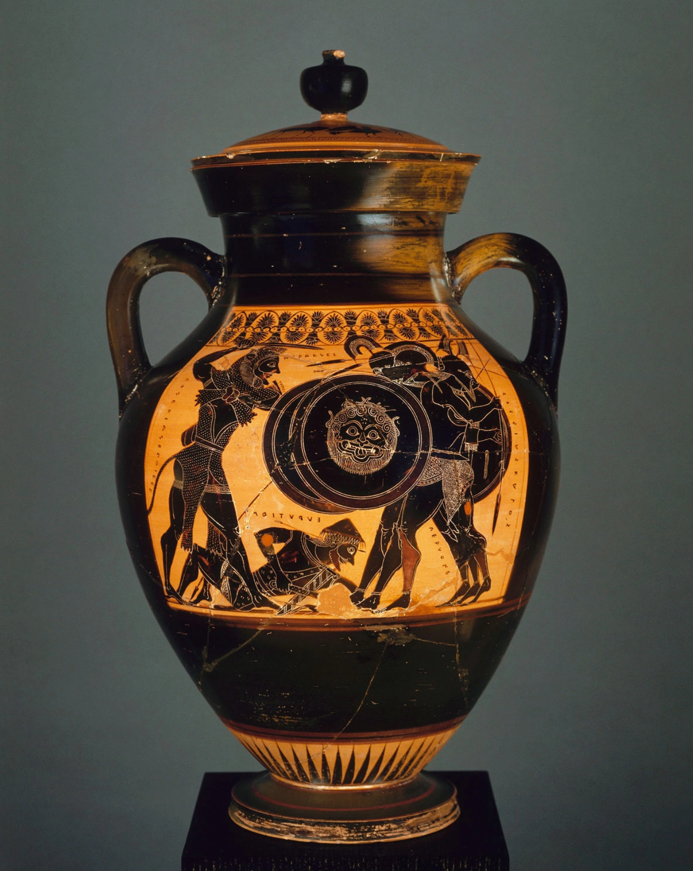 Hercule luttant contre Géryon, amphore à figures noires, vers 550-540 av. J-C., Paris, Musée du Louvre.
