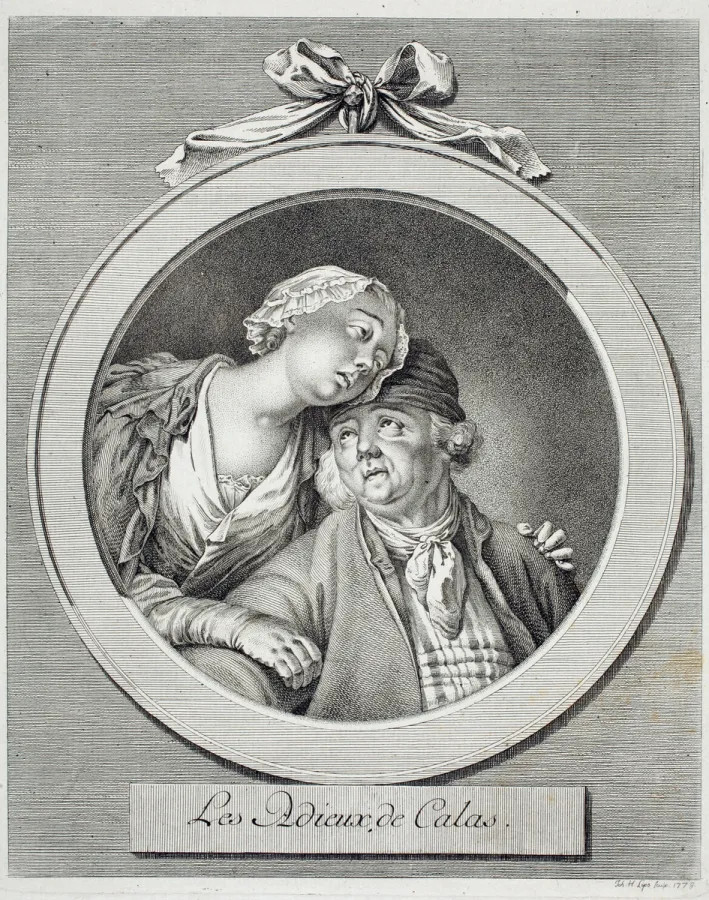 Le portrait est issus d’une lithographie sur les adieux de Jean Calas à sa famille. On voit ici que le portrait a centré Jean Calas et sa femme dans leurs adieux. Il s’agit de représenter une scène tragique puisque ce sont les adieux des époux avant la mise à mort de Jean Calas.