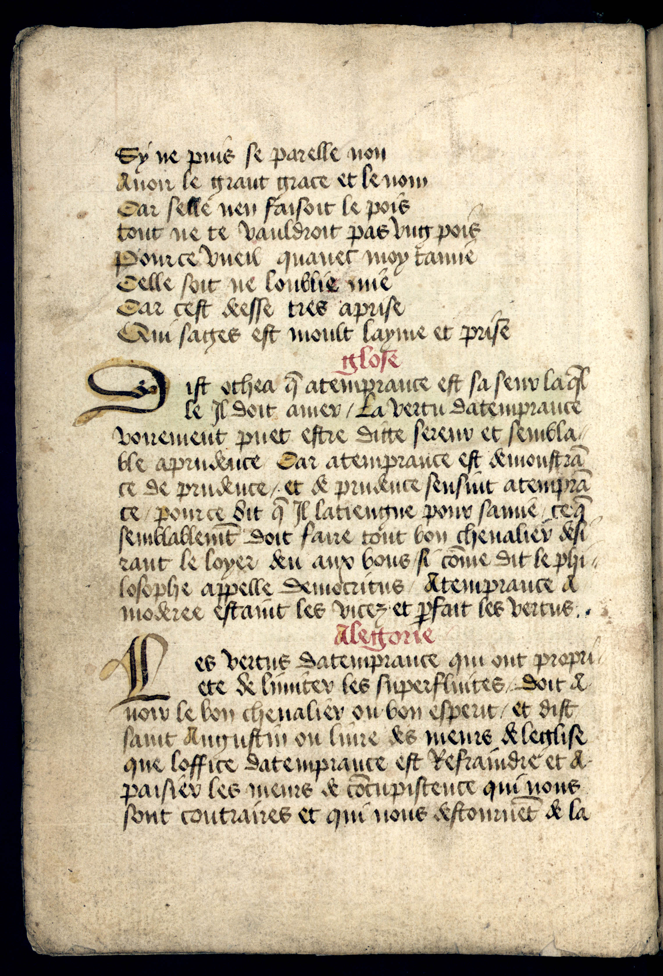 Christine de Pizan mobilise la figure allégorique “d’Attrempance” (Tempérance) pour enseigner une vertu fondamentale qu’est la modération et la maîtrise de soi. Othéa dit à Hector : “Quil te faut fault faire et que tu saches” ; “A toy les vertus plus propisses” ; “Pour mieulx parvenir aux premisses” ; “De vaillance chevalereuse” ; “Est doulce coye et attrempee” ; “Cest la deesse datrempance” ; “Qui sages est moulte layme et prise”. Ces vers soulignent d’emblée l’objectif de l’enseignement qui est d’inculquer les vertus nécessaires au chevalier. Parmi celles-ci, Tempérance est présentée comme indispensable. L’évocation d’Attrempance en tant que “seur germaine” d’Othéa est significative : elle établit une parenté symbolique entre les deux qualités fondamentales que sont la Prudence et la Tempérance. Ce lien est explicité dans la glose : “Attrempance est demonstrance de prudence, et de prudence s'ensuit attrempance”.