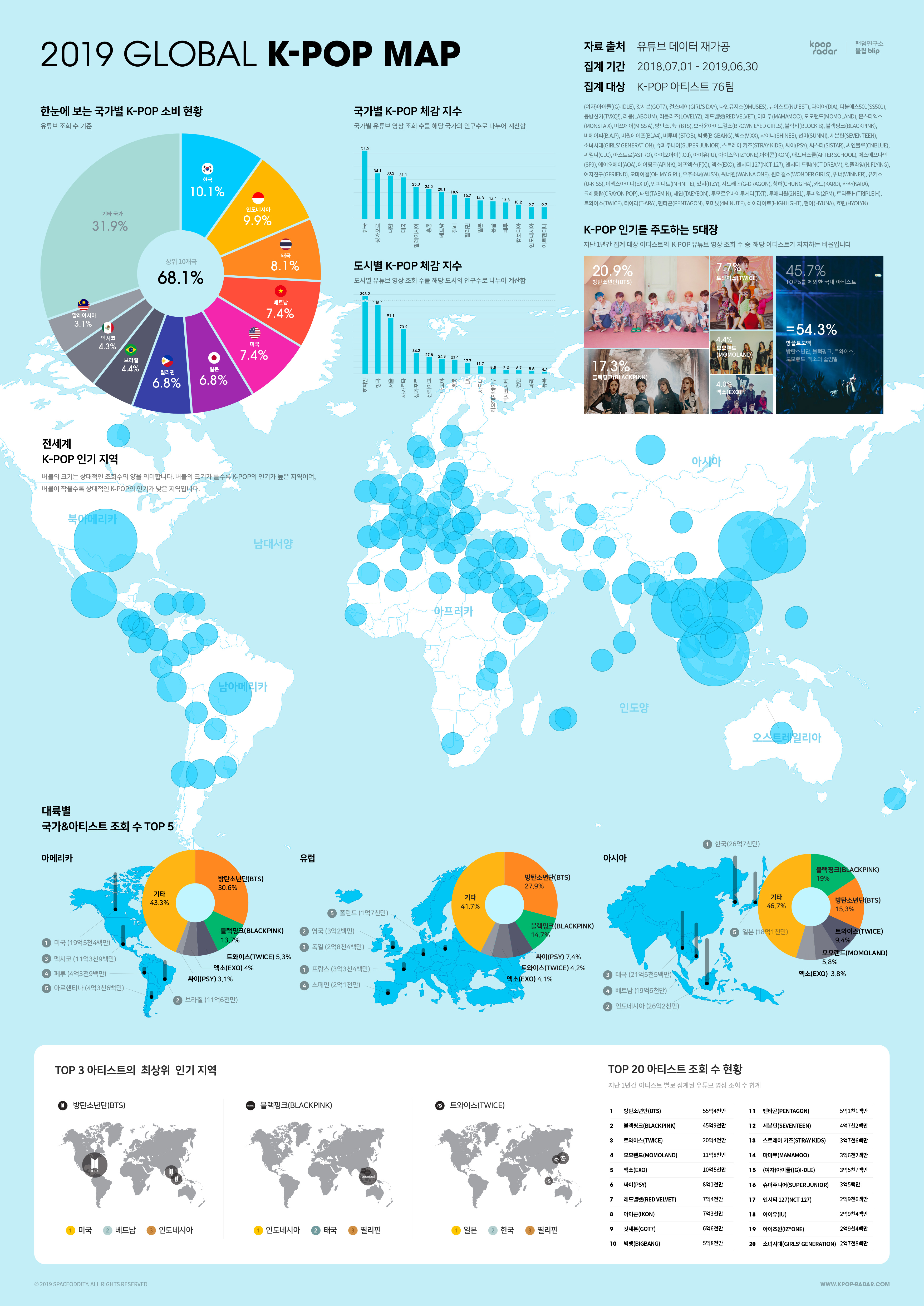 - Carte représentant plusieurs graphiques et statistiques étudiant l'impact global de la K-pop dans le monde, en se basant sur 76 groupes de K-pop.