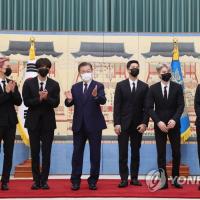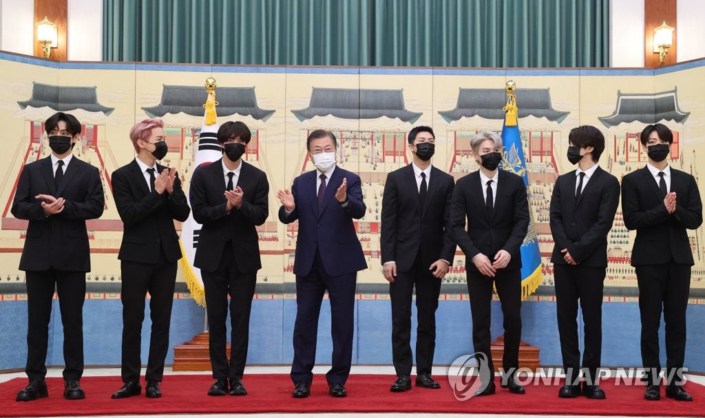 Photographie du président Moon Jae-in accompagné des sept membres de BTS
