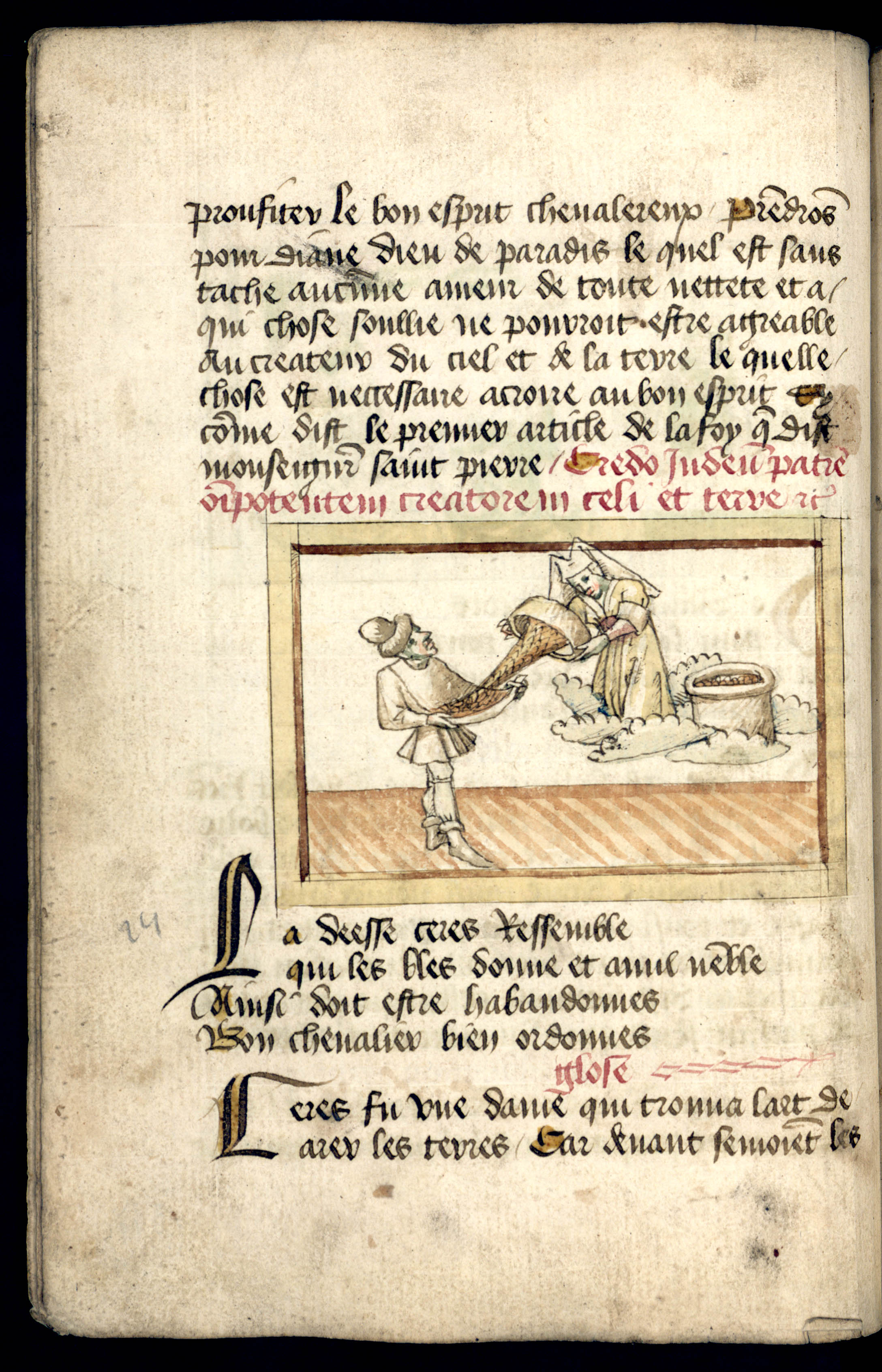Elle renforce cette vertu par une citation d’Hermès : “Cellui ne pouroit est de parfait sens qui en lui naroit chasteté”, liant chasteté et sagesse comme piliers de l’idéal chevaleresque. Enfin, elle invoque le Credo : “Credo in Deum, patrem omnipotentem, creatorem celi et terre” (Je crois en Dieu, le Père tout-puissant, Créateur du ciel et de la terre), soulignant que la pureté de l’âme est indissociable de la foi