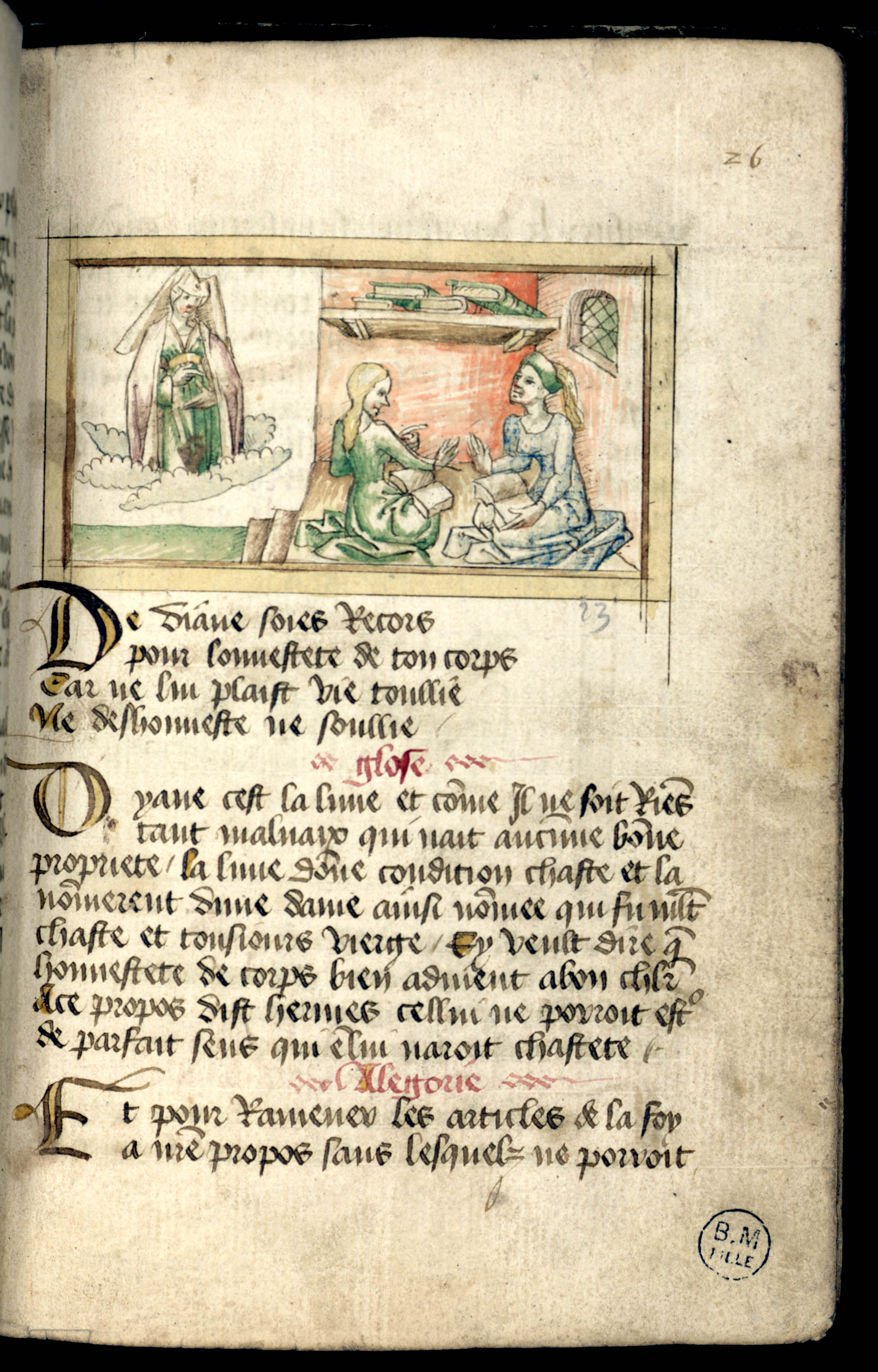 Diane, déesse de la lune et de la chasteté, pour enseigner l’importance de “lonnesteté de/du (ton) corps”. Elle est associée ici à une pureté morale, devenant une figure doublement symbolique : à la fois mythologique et chrétienne. Par une assimilation théologique, Christine écrit : “prendrons pour Diane Dieu de paradis le quel est sans tache aucune ameur de toute netteté”, transformant ainsi Diane en un archétype de perfection divine, lié à la foi chrétienne