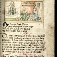 La miniature se divise en deux registres distincts. À gauche, la figure de la Chasteté (Diane) est représentée sur un nuage, suggérant sa transcendance et son éloignement des préoccupations terrestres. À droite, deux femmes discutent dans un cadre domestique ou intellectuel, notamment par la présence de livres. L’une, vêtue de vert, semble expliquer ou argumenter, son doigt pointé vers l’autre, tandis que cette dernière, en bleu, adopte une posture ouverte et à l’écoute. Les livres ouverts que les deux femmes tiennent sur leurs genoux, ainsi que la bibliothèque visible en arrière-plan, renforcent l’idée d’un débat plus ou moins éclairé. Ce cadre savant est particulièrement notable, car il offre une rare représentation des femmes en tant qu’actrices de la pensée intellectuelle et morale, et il s’inscrit dans le projet de Christine de Pizan, qui promeut la place des femmes dans les domaines du savoir et de la réflexion.