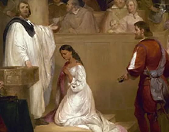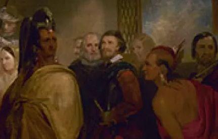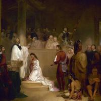 - Ce tableau représente la cérémonie au cours de laquelle Pocahontas, fille du chef Powhatan, a été baptisée et a reçu le nom de Rebecca dans une église anglicane. Elle a eu lieu en 1613 ou 1614 dans la colonie de Jamestown, en Virginie, première colonie anglaise permanente sur le continent nord-américain. On pense que Pocahontas est le premier indigène converti au christianisme dans les colonies anglaises ; cette cérémonie et son mariage ultérieur avec John Rolfe ont contribué à établir des relations pacifiques entre les colons et les tribus de Tidewater.
