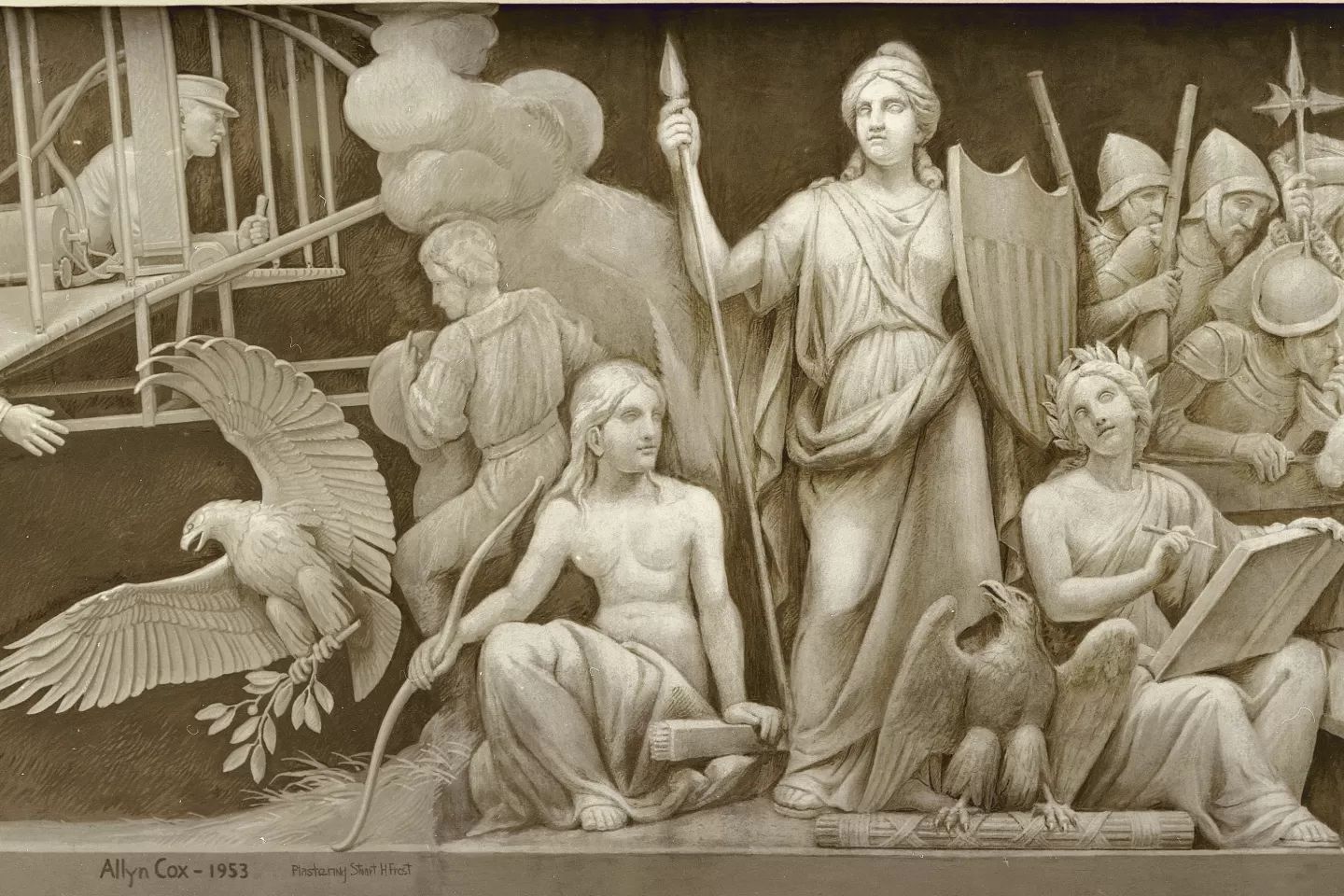 - En 1951, Allyn Cox fut chargé de peindre les trois derniers panneaux retraçant l'essor de la nation depuis la guerre de Sécession jusqu'à la naissance de l'aviation. Il nettoya et retoucha également la frise.