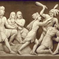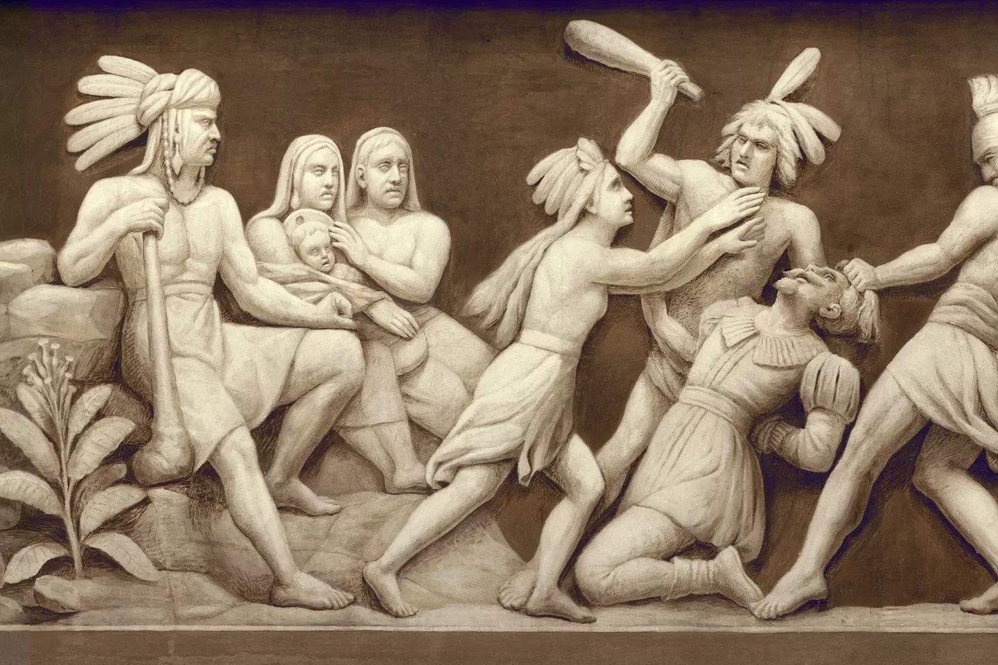 - Pocahontas sauve le capitaine John Smith, l'un des fondateurs de Jamestown, en Virginie, d'être matraqué à mort. Son père, le chef Powhatan, est assis à gauche. Cette scène est la première montrant une colonie anglaise sur la frise.