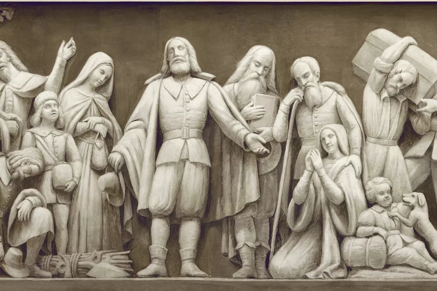 - Partie de la frise de la rotonde du Capitole illustrant l'arrivée des Puritains dans la baie de Cape Cod en 1620.