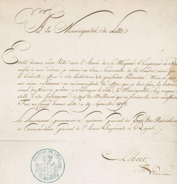 Le 29 septembre au matin, un officier supérieur autrichien vient présenter la sommation du commandant général de l’armée impériale, Albert de Saxe. Il s’agit d’une sommation adressée au commandant des troupes lilloises. Il est écrit : “A la municipalité de Lille. Établi devant votre ville avec l’armée de Sa majesté l’Empereur et Roi, confiée à mes ordres, je viens en vous sommant de la rendre ainsi que la citadelle, offrir à ses habitants sa puissante protection. Mais si par une vaine résistance, on méconnaissait les offres que je leur fais ; les batteries étant dressées et prêtes de foudroyer la ville, la municipalité sera responsable à ses concitoyens de tous les malheurs qui en seraient la suite nécessaire. Fait au camp devant Lille, le 29 septembre 1792”.
