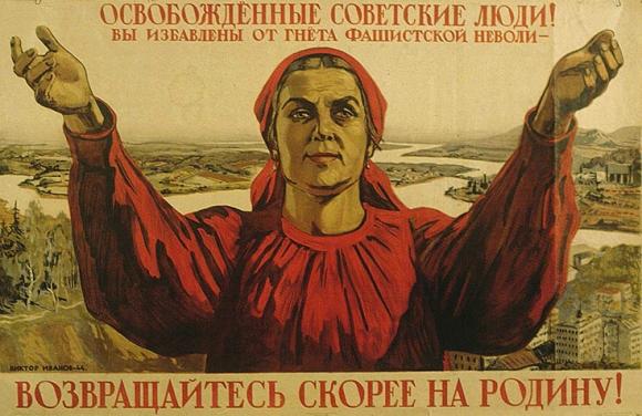 Caricature d'un soldat soviétique, tenant en main un drapeau rouge (symbole soviétique), poignardant un soldat nazi, au sol, dans l'obscurité. Le soldat soviétique se dirige, dans la lumière, vers l'avenir.