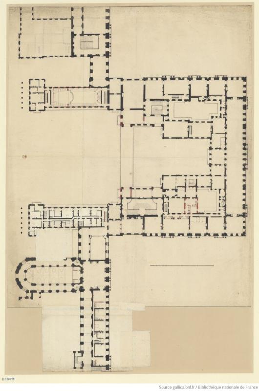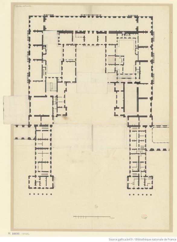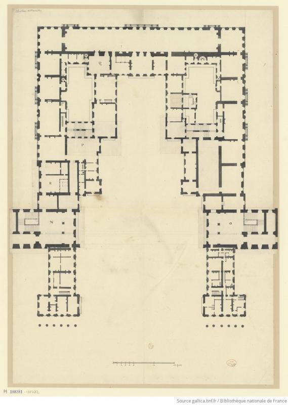 Le plan est à une échelle inconnue. Ce plan est présumé celui du rez-de-chaussée par la présence des jardins, et celle du Perystile, aussi nommé Galerie, qui fait face à la terrasse. Les trois principales ailes du château (ailes du Midi, Centrale, et du Nord) y sont représentées dans leur intégralité.