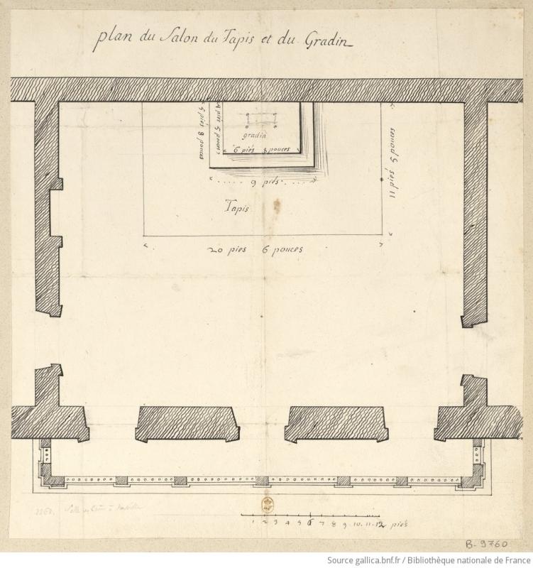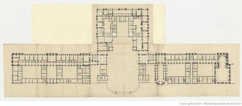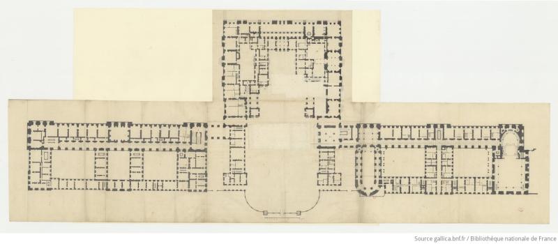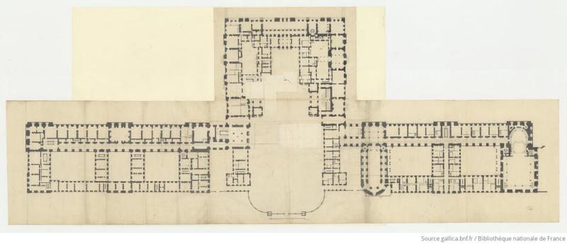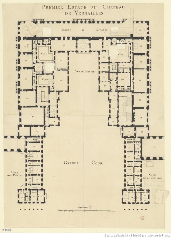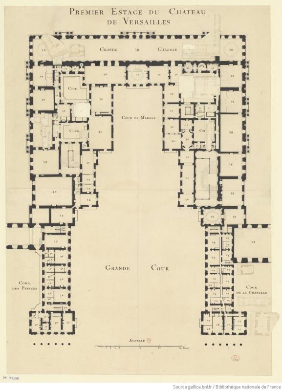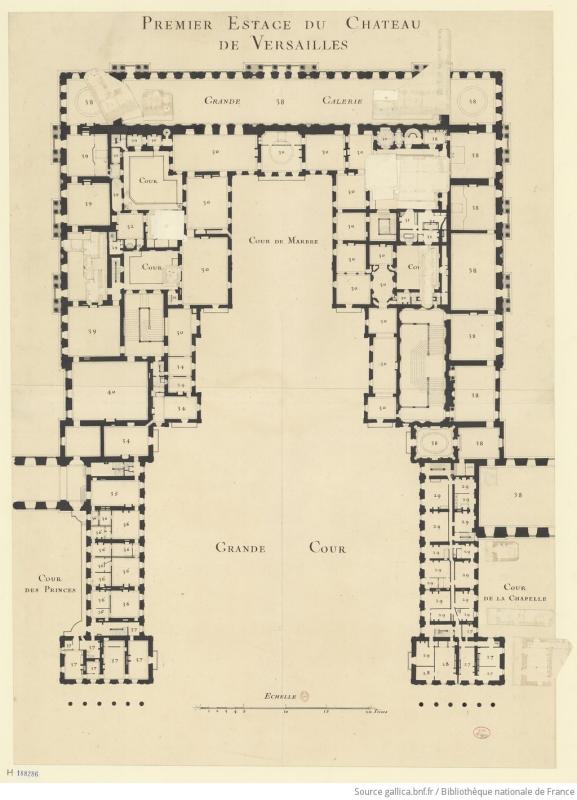 Le plan est à une échelle de 15 toises. Ce plan a la particularité d'être avec et sans retombe, à l'inverse de la version sans retombe, la principale zone de modification est à l'Est de la Cour de Marbre, vers le salon de Mars.