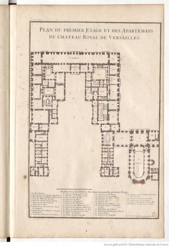 Le plan est légendé à destination du roi, et est issu d'un livre de type "guide de visite" coutumier au XVIIIe siècle, l'échelle n'est pas précisée. Cette œuvre a été publiée par privilège du Roi. La Grande Sacristie, l'un des principaux ajouts à la suite des travaux de la Chapelle qui s'achèvent en 1710 par Robert de Cotte, est visible sur la partie droite de la Chapelle, au dessus du numéro 38.
