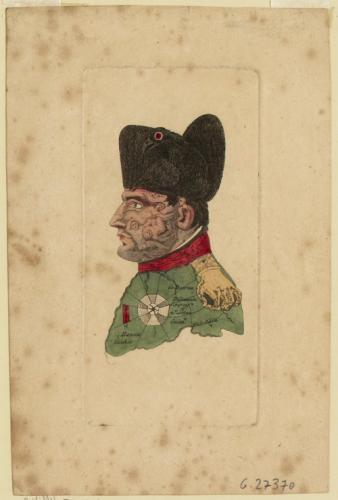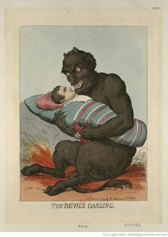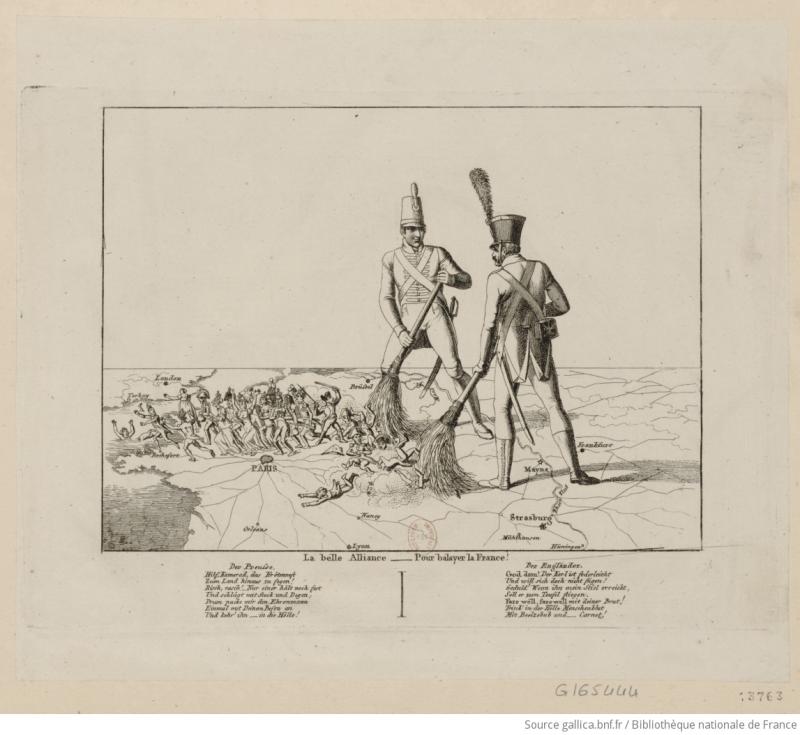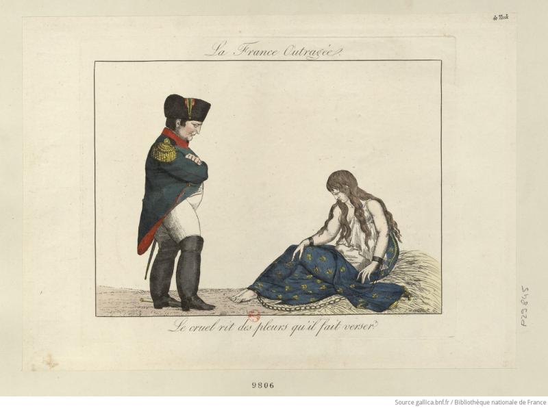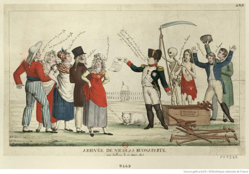 caricature royaliste. 1815, fin de la censure Napoléonienne et essor de la satire Napoléonienne. Une des critiques courante, qui est représentée ici, est la soif de gloire et de conquête, associées à la guerre, de Bonaparte et générant un fort mécontentement des poopulations.