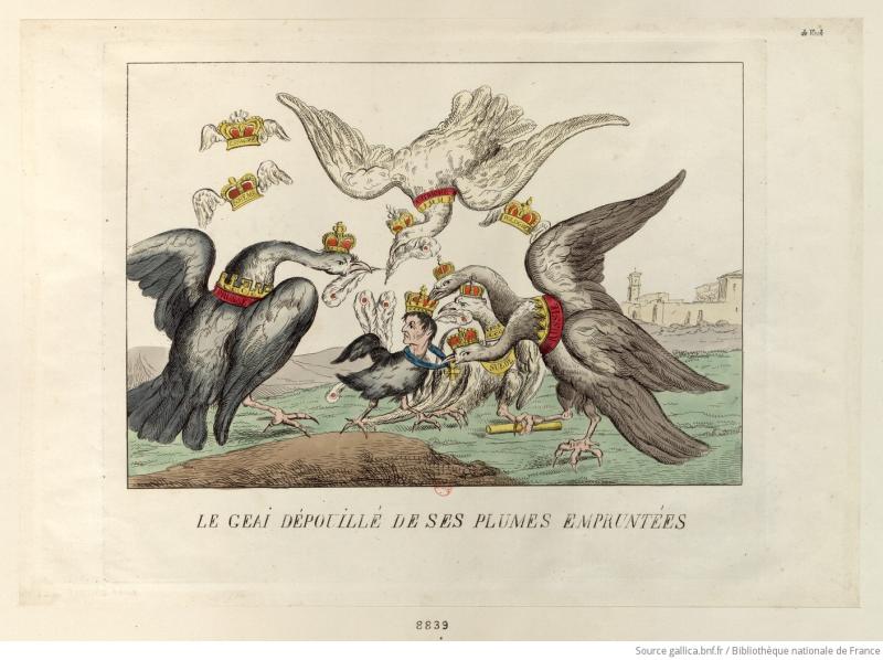 Napoléon en geai, paré de plumes de paon aux ailes et à la queue. Plumes appartenant apparemment aux paons autour de lui, représentant la coalition (Suède, Russie, Autriche et Prusse)