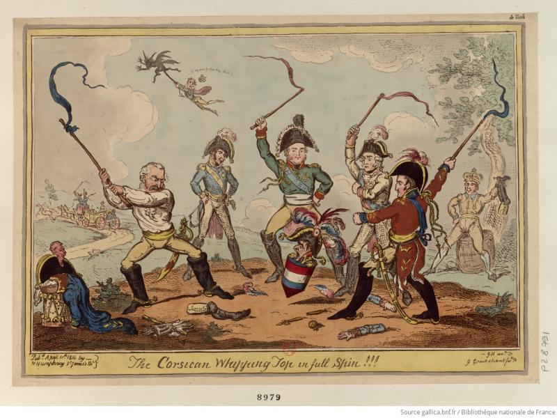Une toupie tricolore représentant Napoléon fouetté par la coalition (Prusse, Autriche, Suède, Angleterre), ses bras et ses jambes ayant déjà été détachés de son corps et gisant sur le sol.