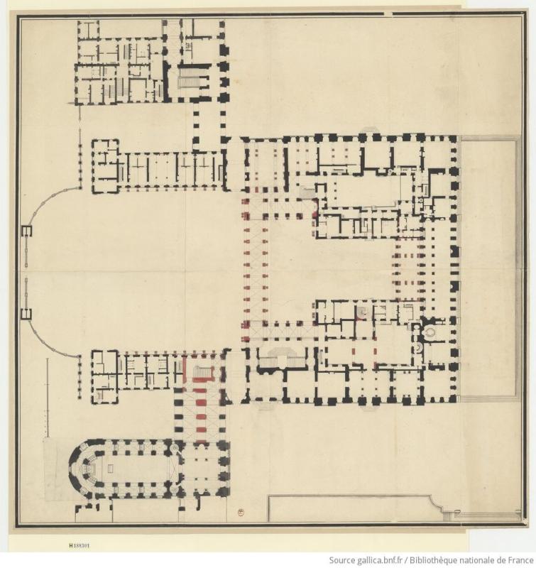 Ce plan est à une échelle de 15 toises. On y voit notamment en rouge les propositions de modifications du chemin d'accès à la chapelle provisoire.