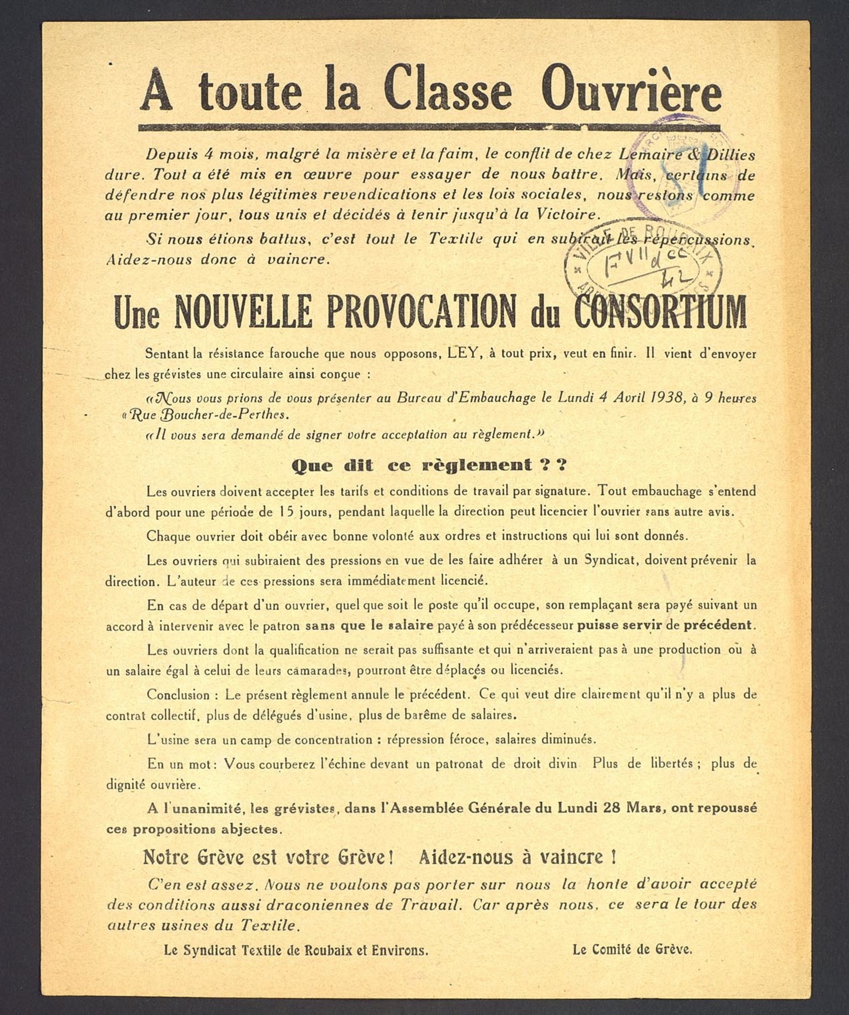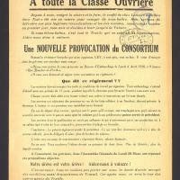 - Trac ouvrier diffusé conjointement par le syndicat textile de Roubaix et ses environs et le comité de grève, pendant les grèves de 1938 dénonçant une nouvelle provocation du Consortium et de son représentatn, Désiré Ley.
