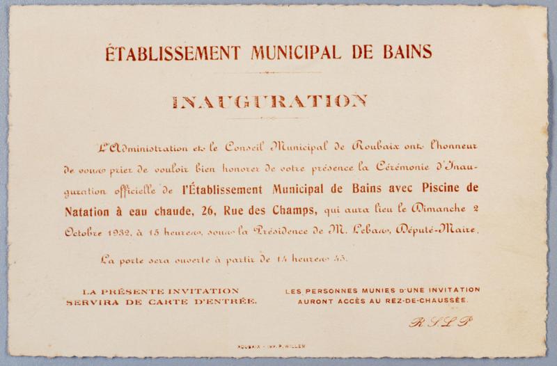 Carton d'invitation à l'inauguration piscine de Roubaix